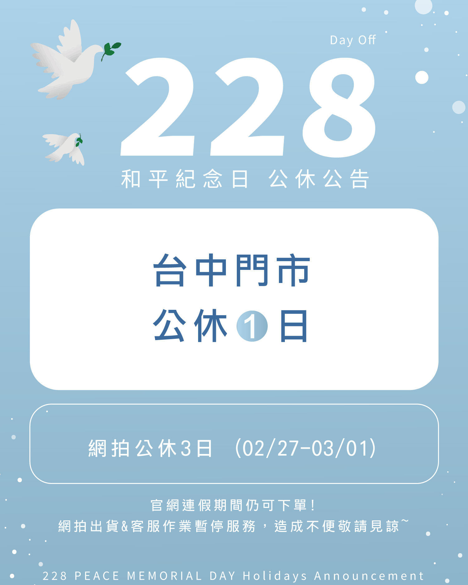 🇹🇼 𝟐𝟎𝟐𝟔/𝟎𝟐/𝟐𝟖 🇹🇼 和平紀念日 公休公告 📍 台中門市 【2/28(六)公休 1 日】 當日暫停營業一天,請媽咪們留意時間避免撲空 其餘假日皆正常營業唷,歡迎到門市試穿、逛逛 🛍️ 🛒 網拍服務 【2/27(五)-3/1(日)公休 3 日】 期間暫停出貨與客服作業,官網仍可正常下單 👌 休假期間的訂單、留言與問題,將於上班日依序處理與回覆 💬 造成不便敬請見諒,感謝媽咪們的體諒與支持 🤍 #棠棠媽咪孕婦裝 #公休公告 #和平紀念日