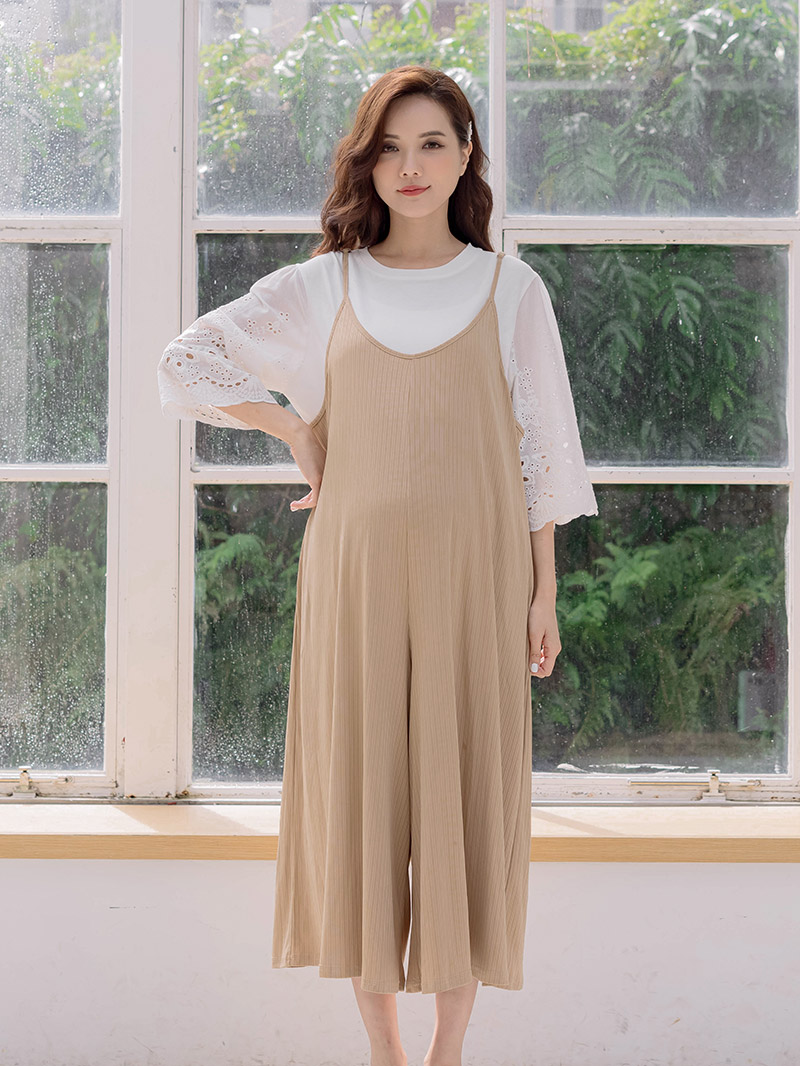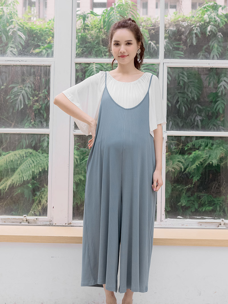 孕婦褲。坑條側袋連身大寬褲(Q彈)