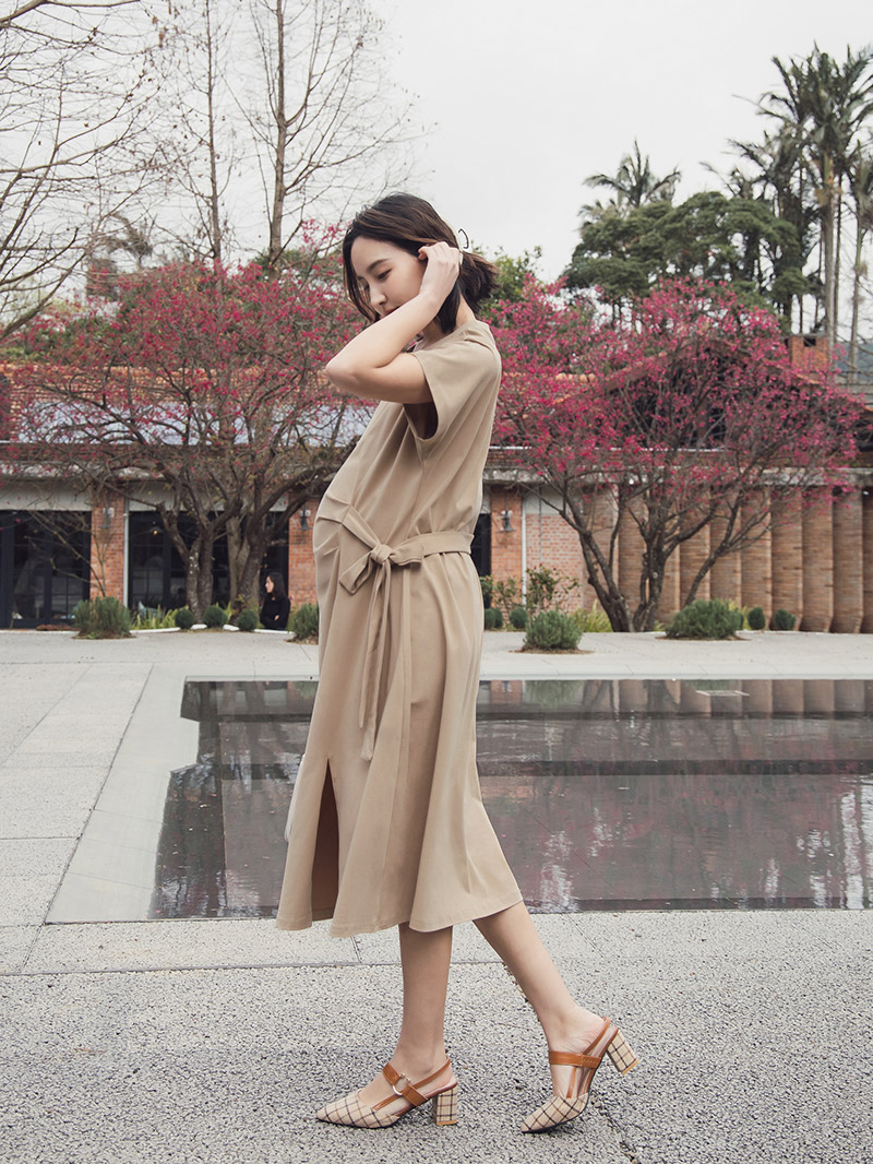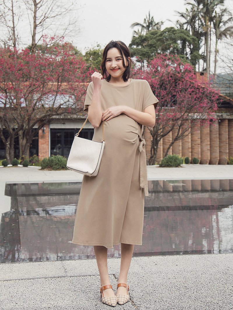 孕婦裝。滑棉側抓摺綁帶前衩洋裝