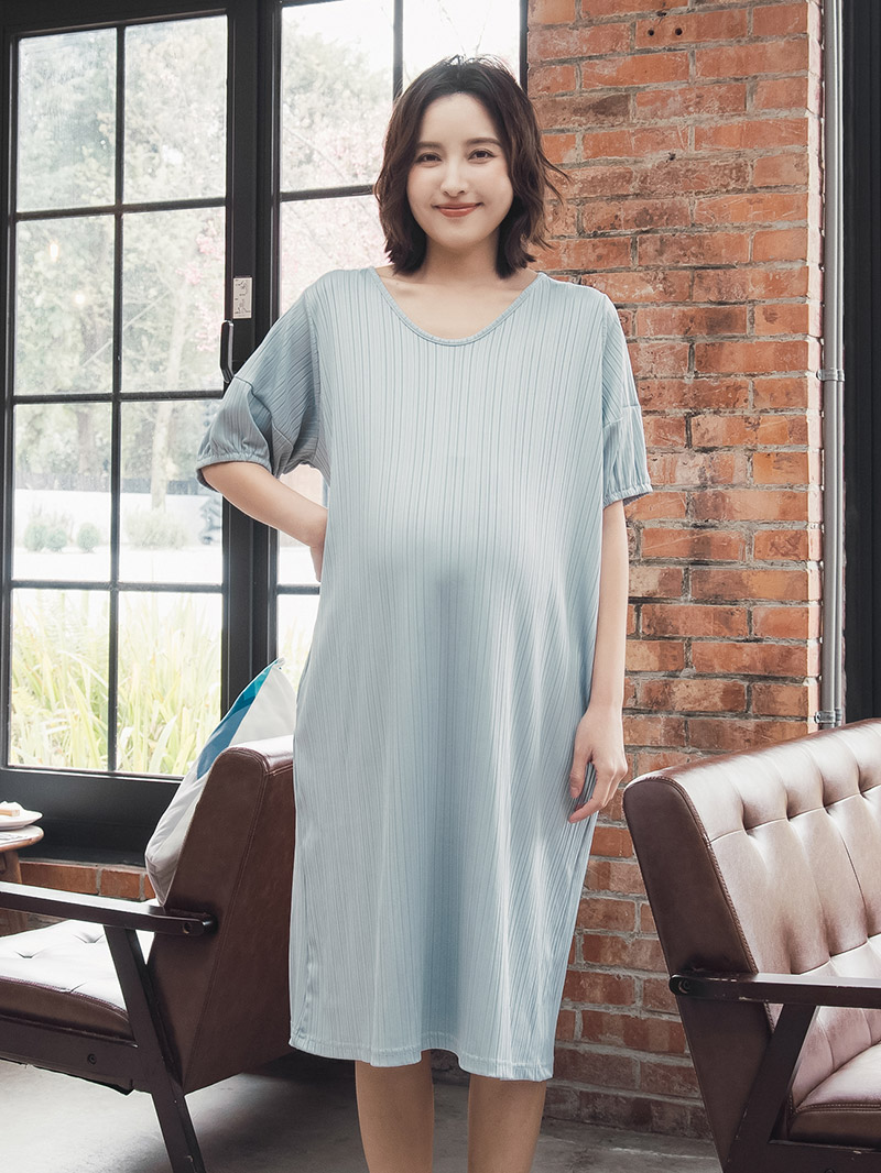 孕婦裝。絲光坑條彈性袖側袋洋裝(彈)