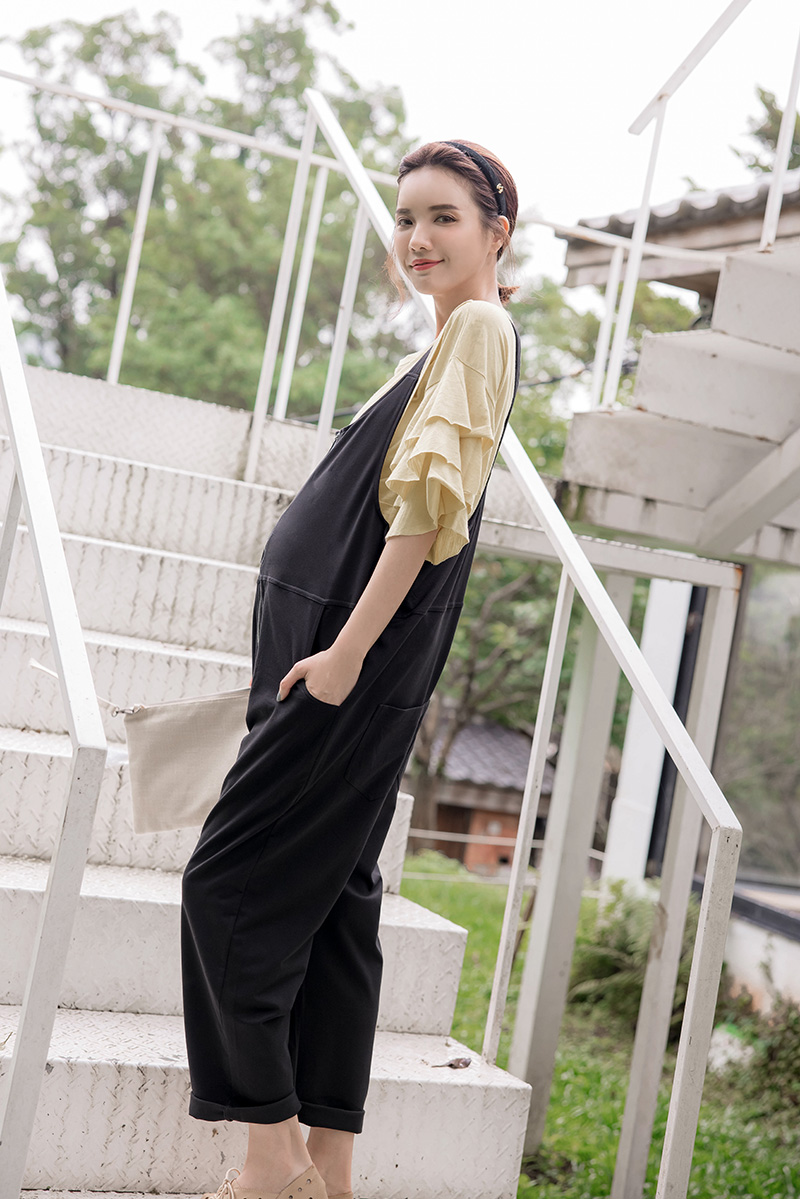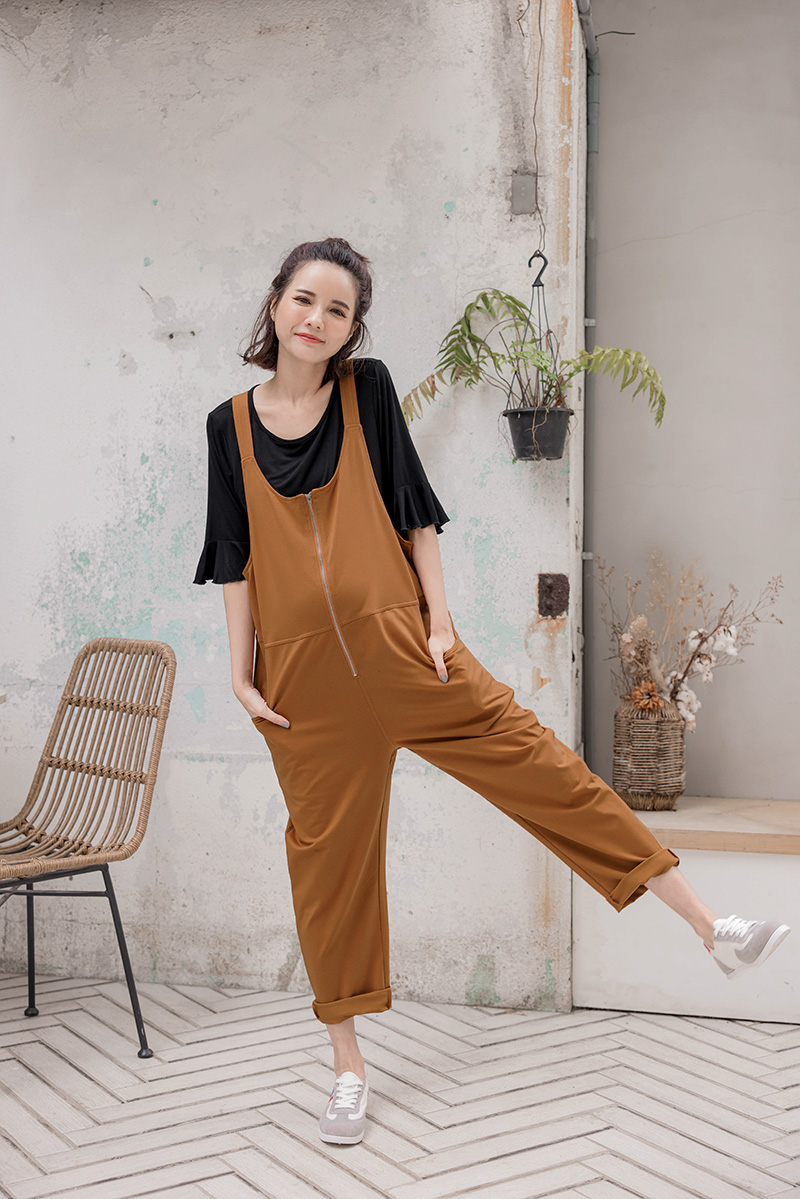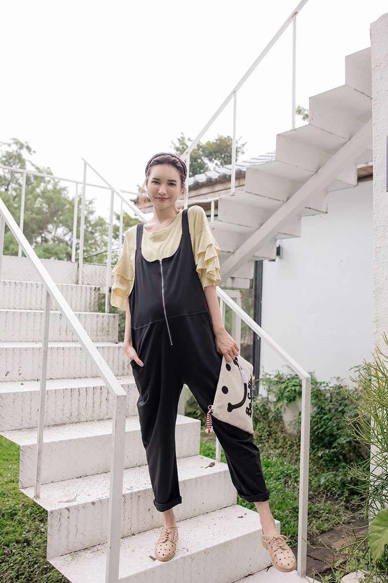 吊帶褲。前拉鏈雙袋薄棉連身褲