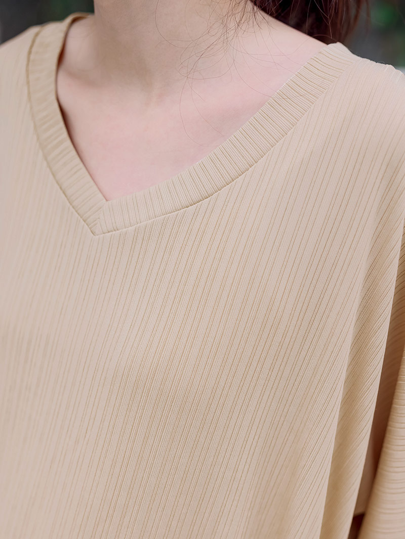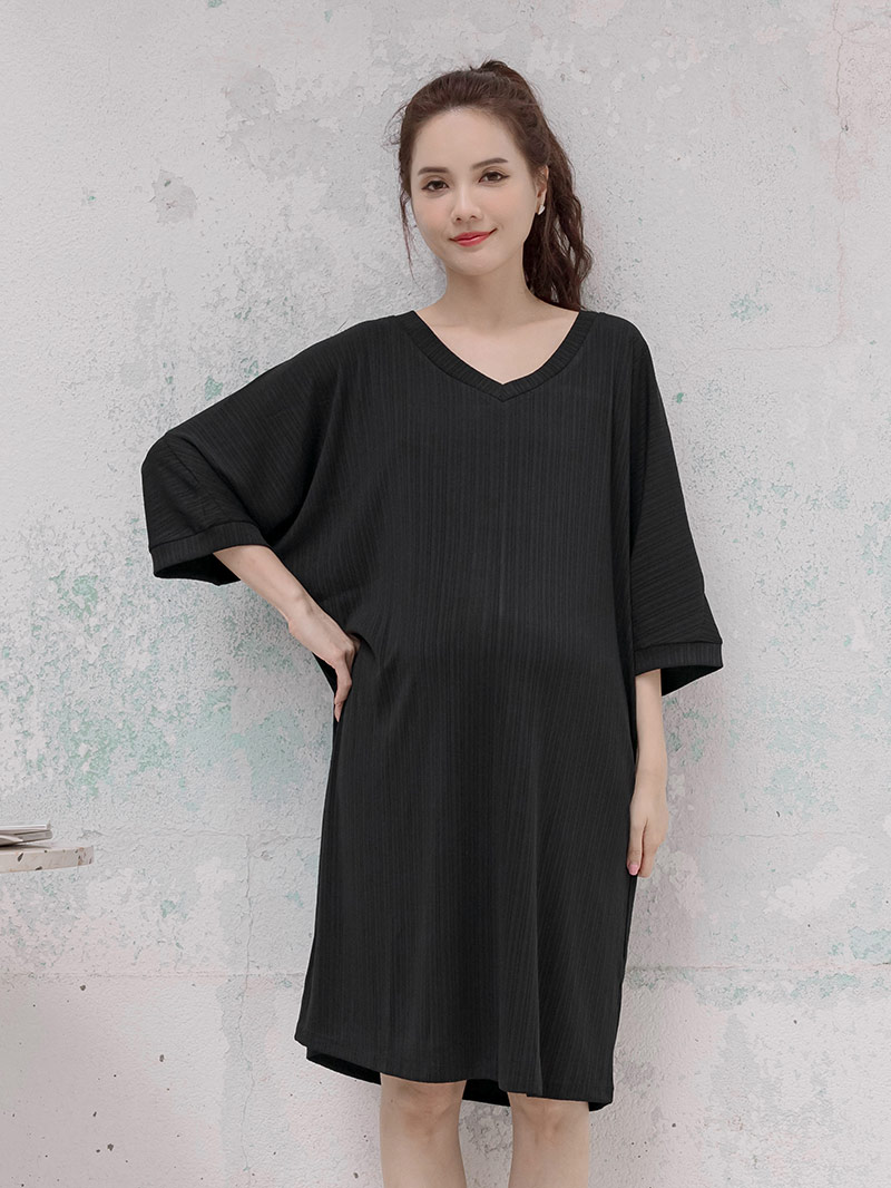 孕婦裝。V領五分袖絲光坑條側袋洋(彈)