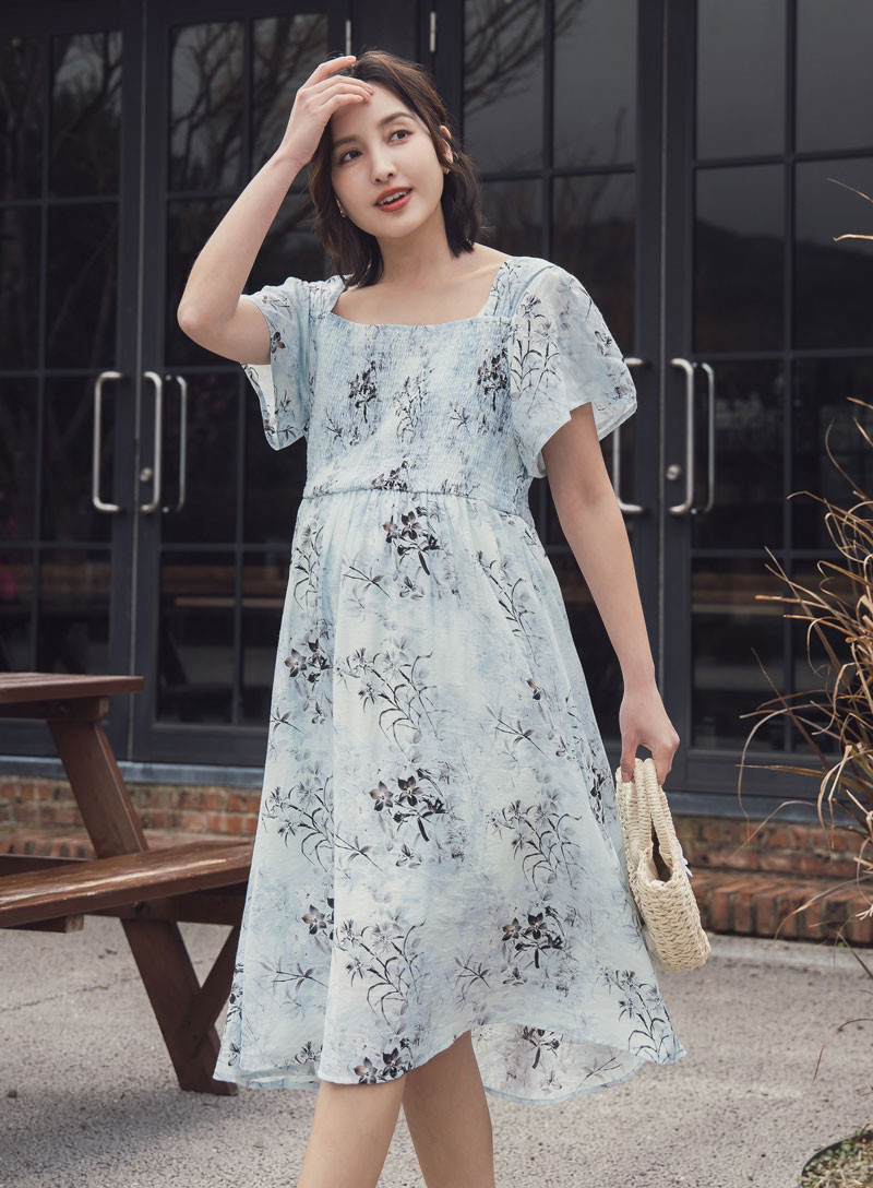 孕婦裝。後綁結墨花彈性高腰娃娃洋