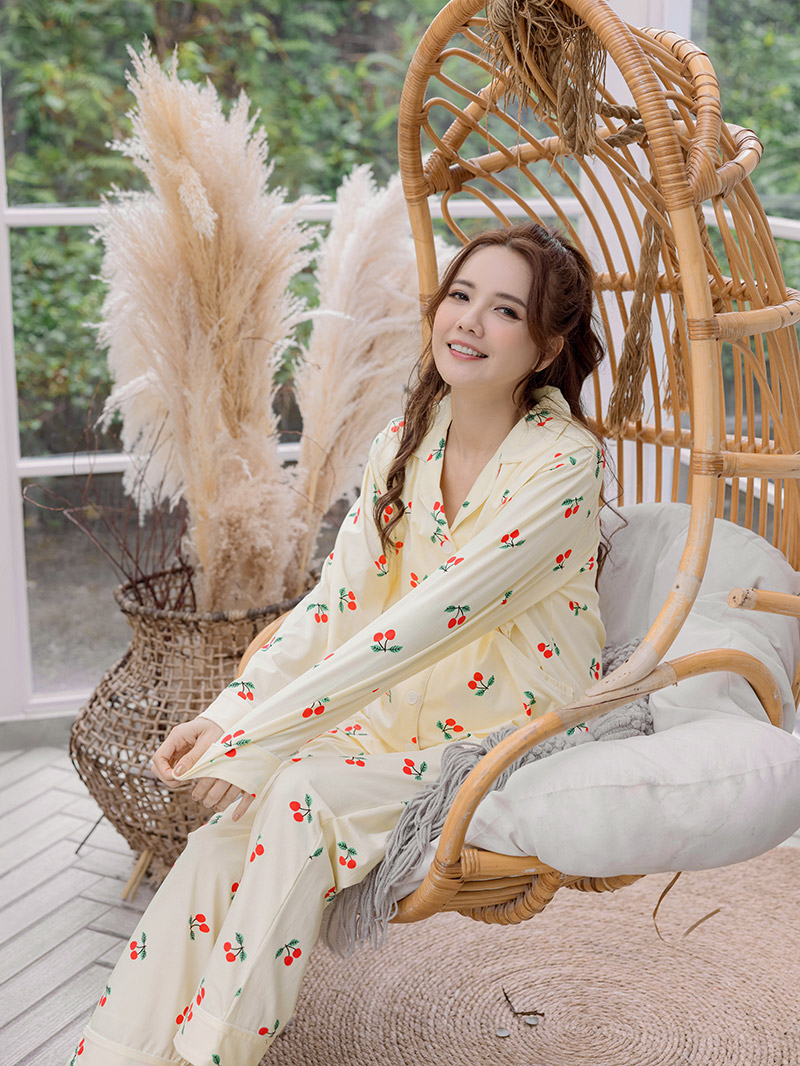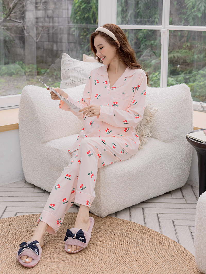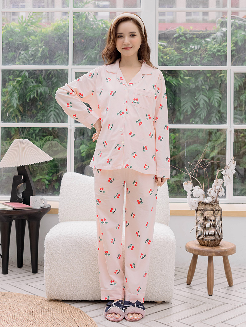 月子服。櫻桃開釦側掀哺乳睡衣+睡褲