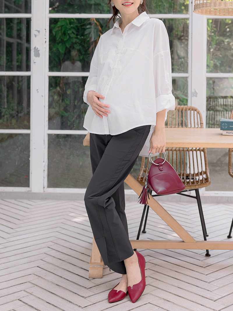 孕婦裝。前圓後造型結長袖襯衫