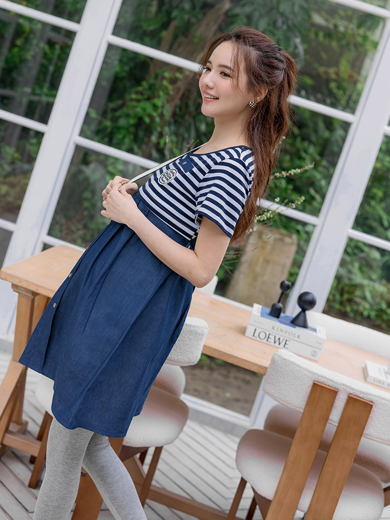 哺乳裝。圓徽章條紋仿牛仔哺乳洋裝